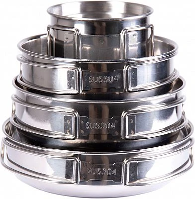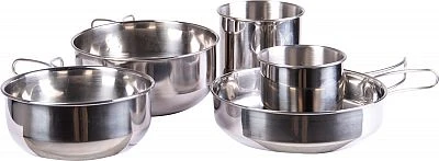 Edelstahl Kochset, bestehend aus drei Töpfen und zwei Bechern.