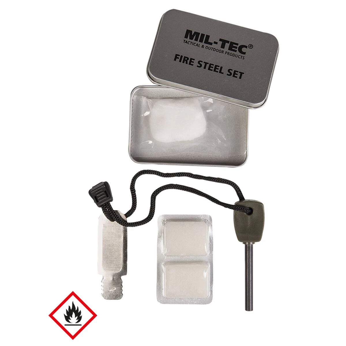Das Fire Steel Set von Mil-Tec ist einfache Anzündhilfe zum Entfachen eines Feuers. Es besteht aus einem kleinen Zündstein mit Schaber und Kordel, 2 Brennstofftabletten und Watte – alles verpackt in einer handlichen Transportbox aus Metall.
