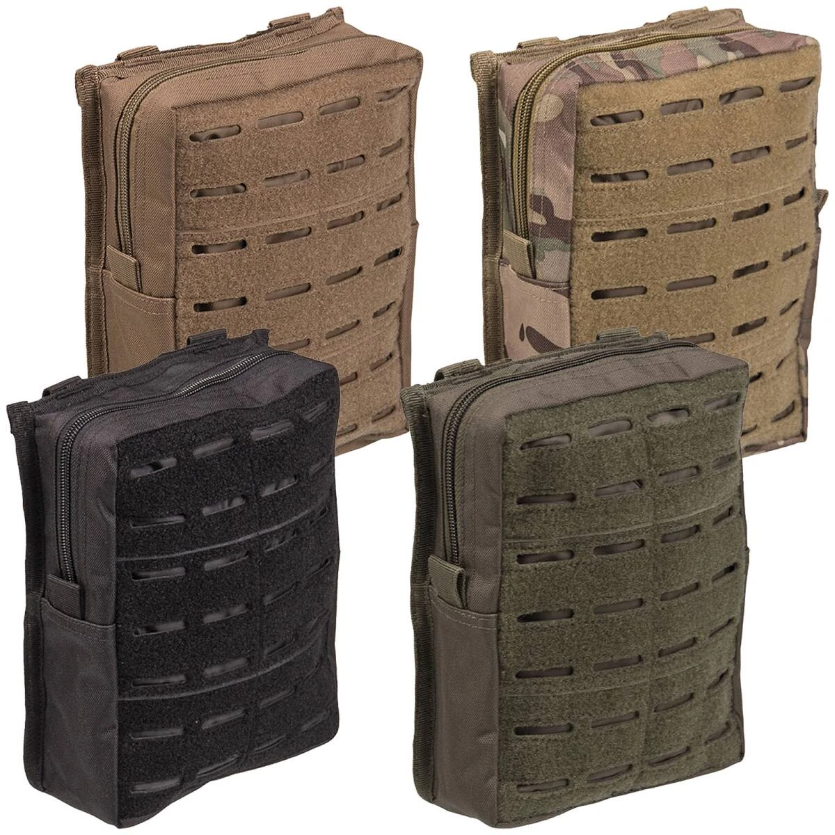 Die praktische Gürteltasche in der großen Ausführung besitzt vorne das bewährte Laser-Cut-Aufnahme-System, welches das Anbringen zusätzlicher Ausrüstungsgegenstände ermöglicht. Auf der vorderen Klettfläche lassen sich bequem Patches oder Abzeichen anbringen. An den Seiten befinden sich Schlaufen, um zusätzliches Equipment anzubringen. Im Inneren besitzt die Tasche ein Hauptfach mit Klettverschlussfach sowie ein Hauptfach mit 2 breiten Gummibändern zum Fixieren von Utensilien. Außerdem gibt es einen 2-Wege-Reißverschluss, eine Ablauföse sowie hinten ein Fixierungssystem mit Molle und Druckknöpfen.
