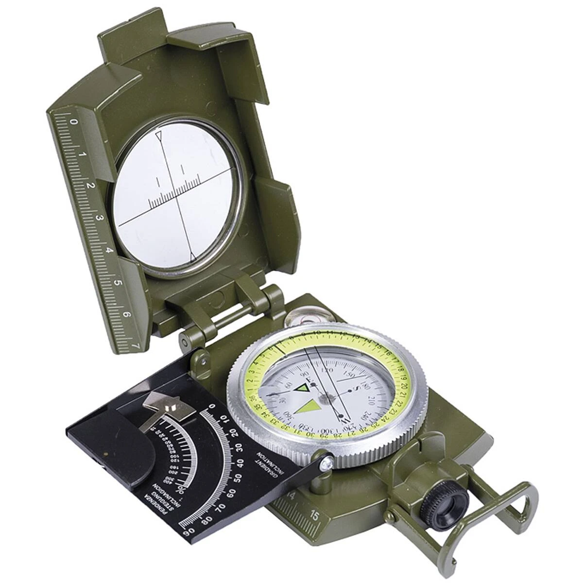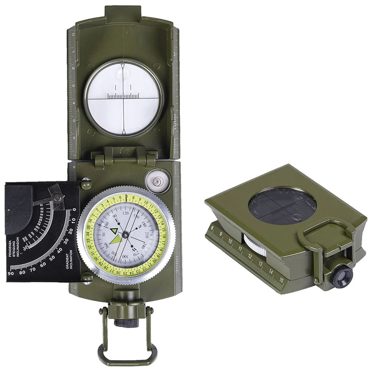 Dieser bewährte italienische flüssigkeitsgedämpfte Armeekompass wird von vielen Nato-Streitkräften eingesetzt. Mit seinem äußerst stabilen Metallgehäuse ist er auch bei Wanderungen ein beliebter und zuverlässiger Begleiter. Der Kompass besitzt im Deckel eine Visiereinrichtung, eine drehbare Skale, eine Anlegekante mit Maßstabseinteilung 1:25.000 sowie auf der Unterseite ein Gewinde, mit dem man den Kompass beispielsweise auf einem Stativ befestigen kann. Des Weiteren gibt es ein Klinometer zum Messen von Neigungen und Höhenunterschieden. Die flouriszierenden Markierungen ermöglichen auch ein genaues Ablesen in der Dunkelheit.