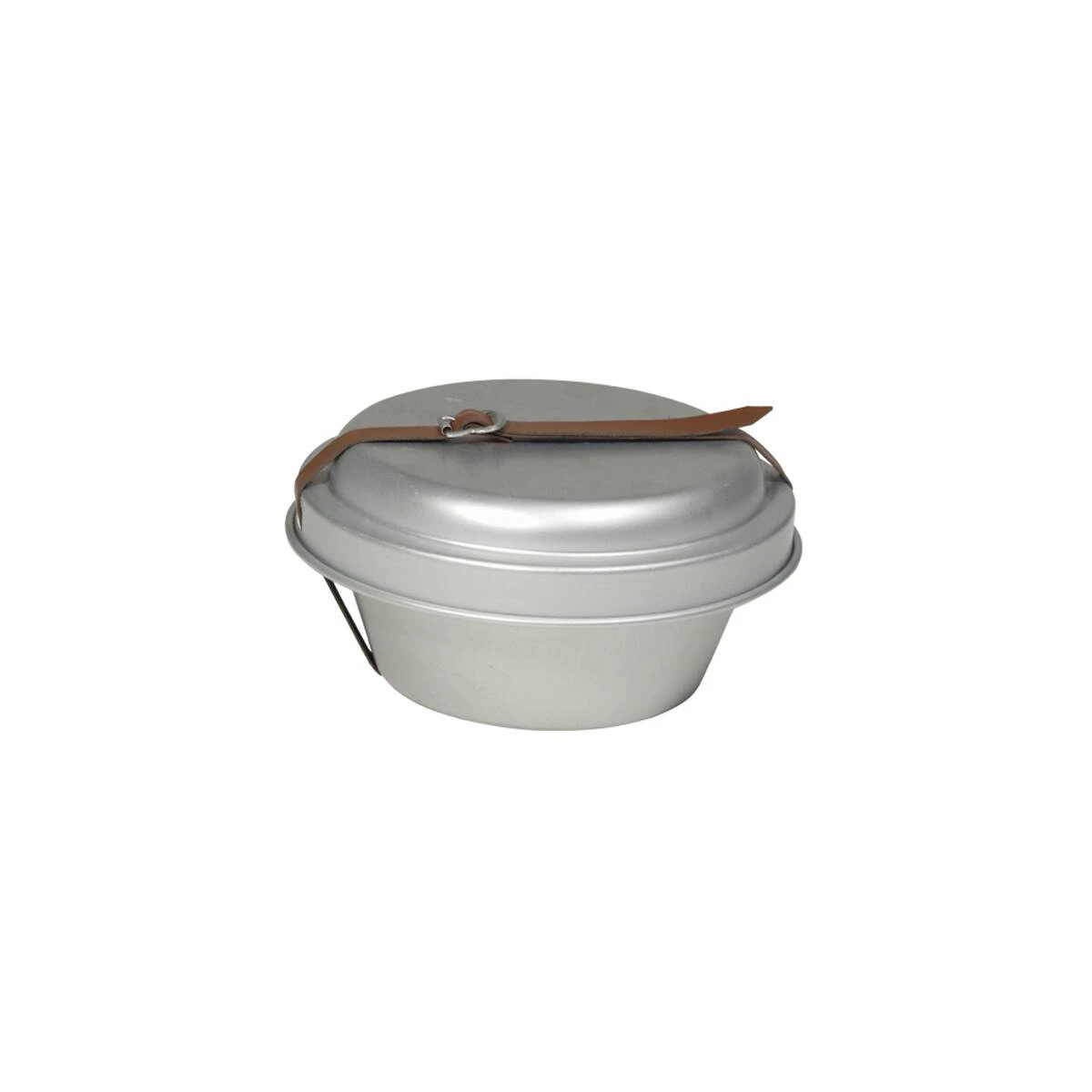 Dieses praktische Koch-Set besteht aus zwei Töpfen, einem Kocheraufsatz, einer Pfanne und einem Messingkocher. Alle Teile können praktisch ineinander gesteckt und mit einem Lederriemen zusammengebunden werden.