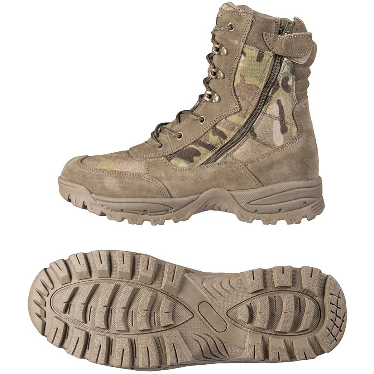 Der hochwertige originalgetreue taktische Einsatzstiefel besitzt einen stabilen YKK-Zipper mit Klettsicherung Das Thinsulate Innenfutter dieses robusten Halb-Schnürstiefels (7-Loch Schnürung) wärmt den Fuß und sorgt für ein angenehmes Fußklima. Die Sohle ist mit einem ausgeprägtem schneetauglichen Profil versehen. Er ist ideal als Arbeits- oder Freizeitstiefel verwendbar. Weitere Merkmale sind der verstärkte Fersenbereich, der gepolsterte Schaftabschluss sowie die Zehenkappe.