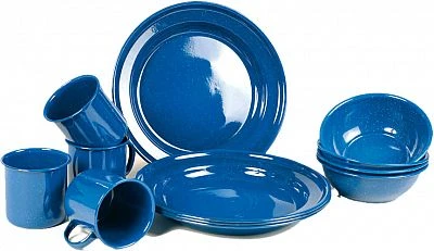 12-teiliges Emaille Essgeschirr-Set im klassischen Western-Stil.